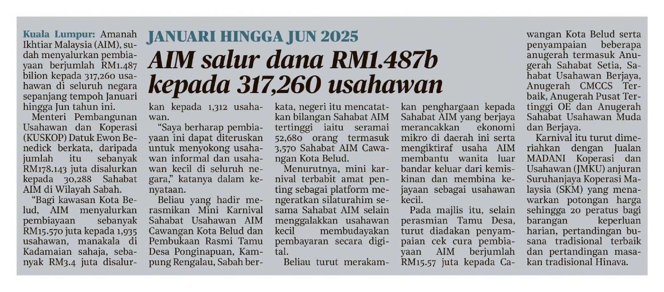 AIM salur dana RM1.487b kepada 317,260 usahawan |