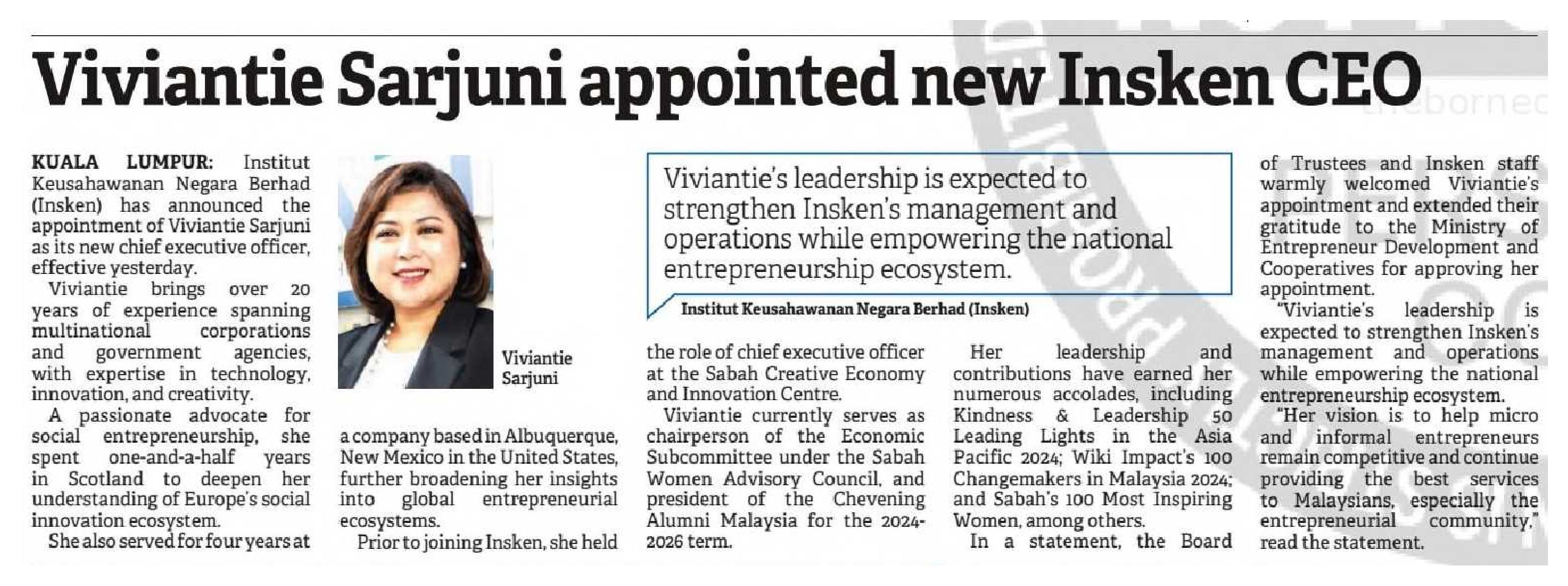 Viviantie Sarjuni dilantik CEO baharu INSKEN |