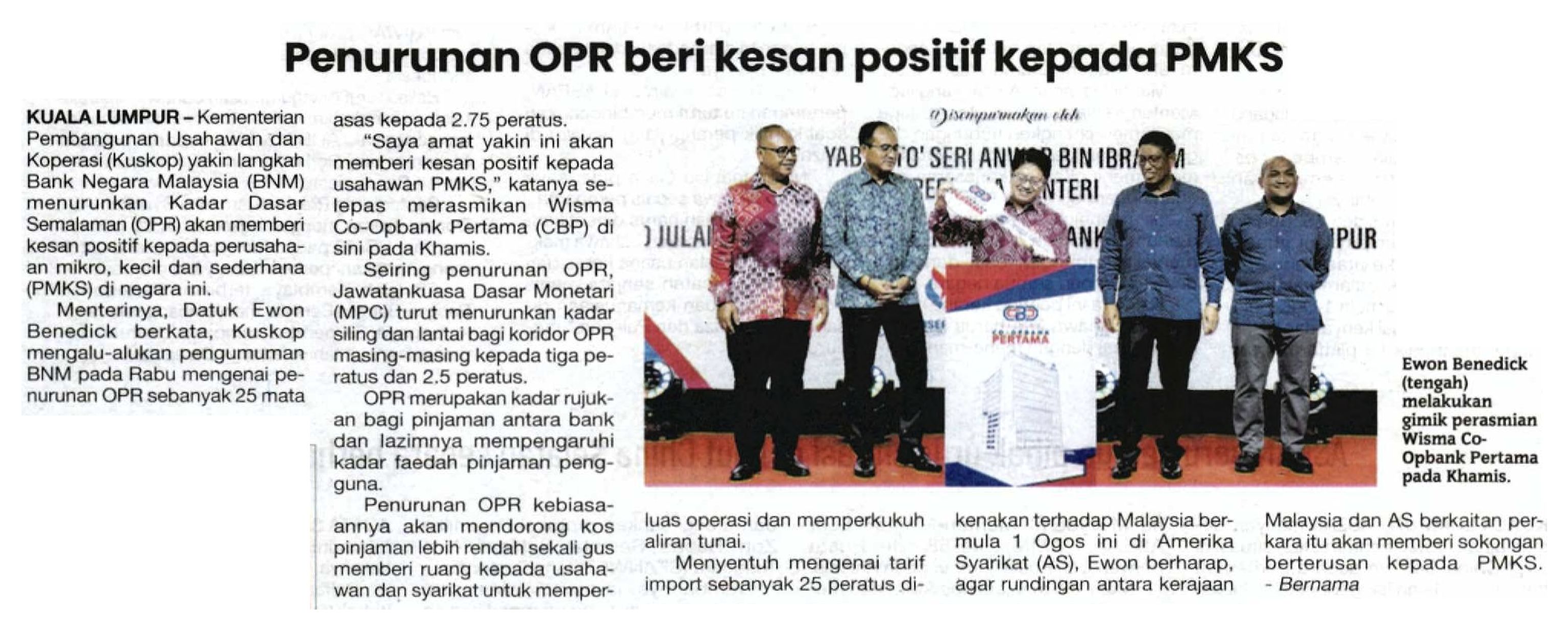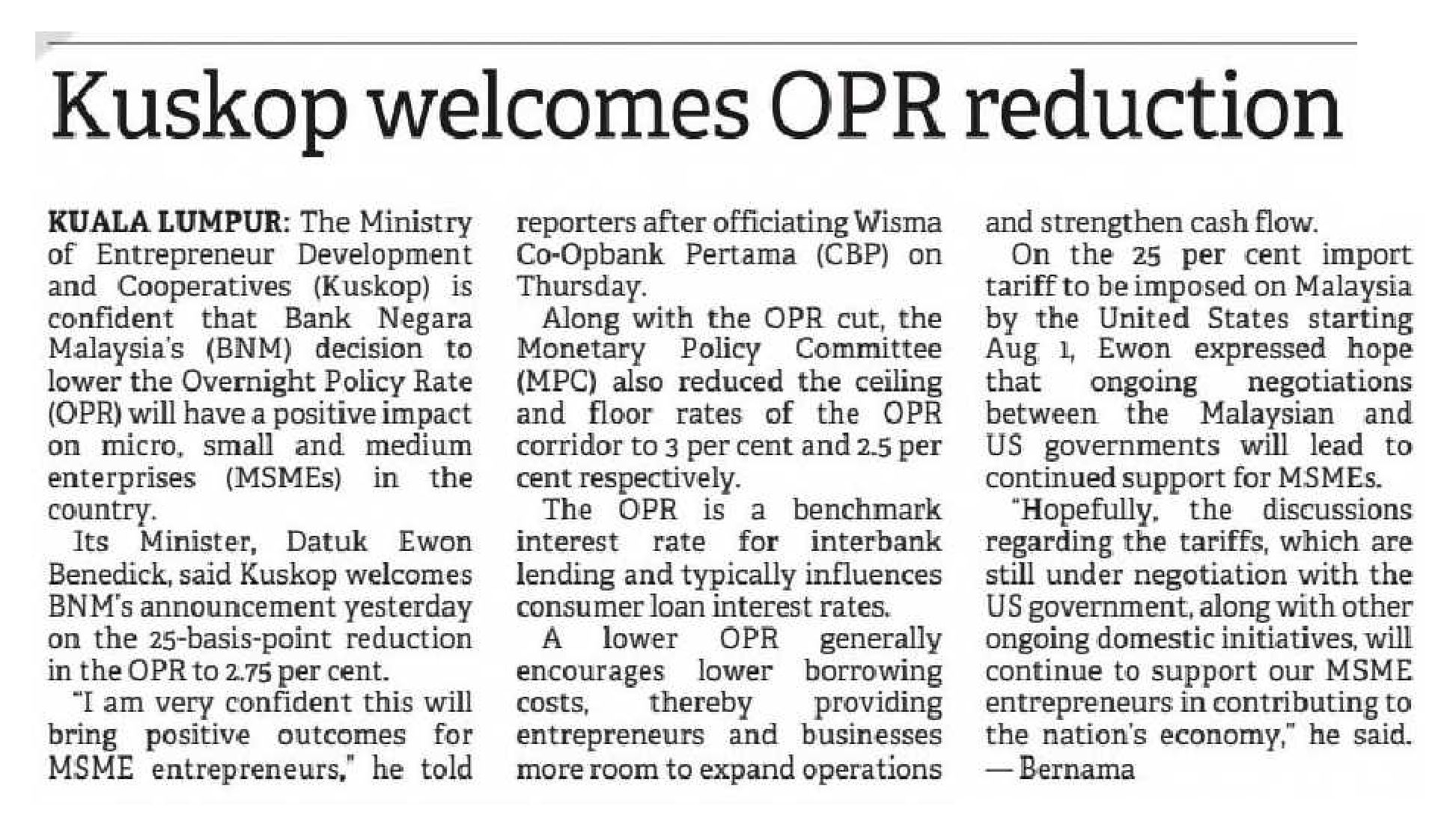 10/7/2025 Malay.News KUSKOP yakin penurunan OPR beri kesan positif kepada PMKS