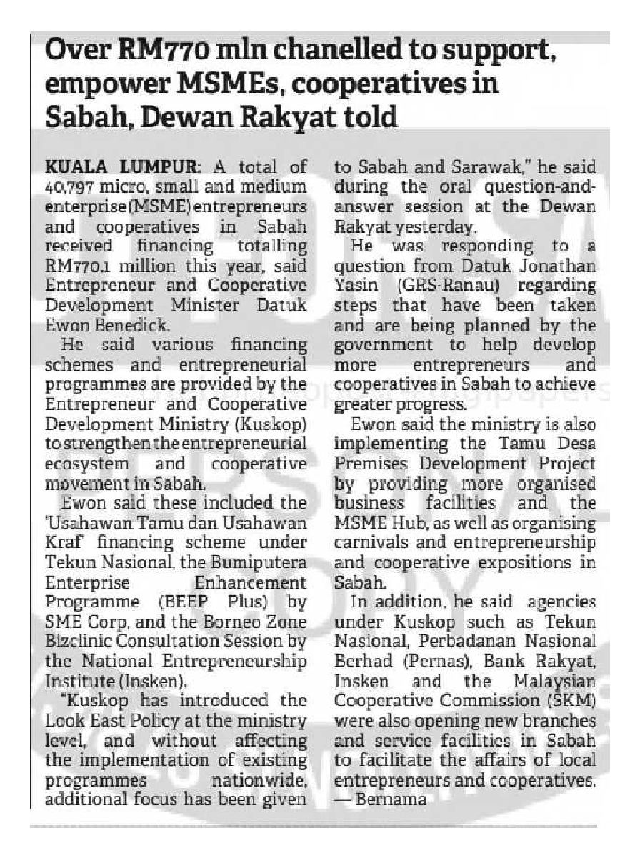 04/11/2025 The Borneo Post Sarawak Over RM770 mln chanelled to support, empower MSMEs, cooperatives in Sabah, Dewan Rakyat told