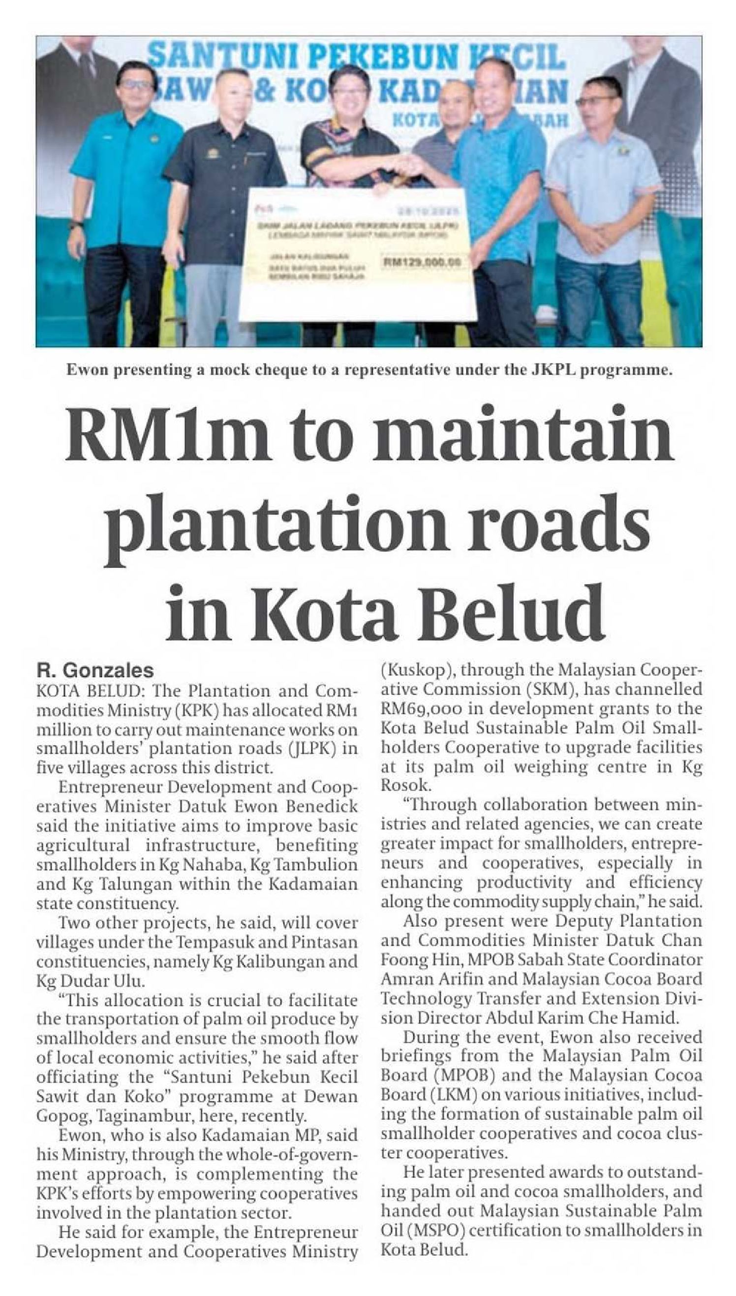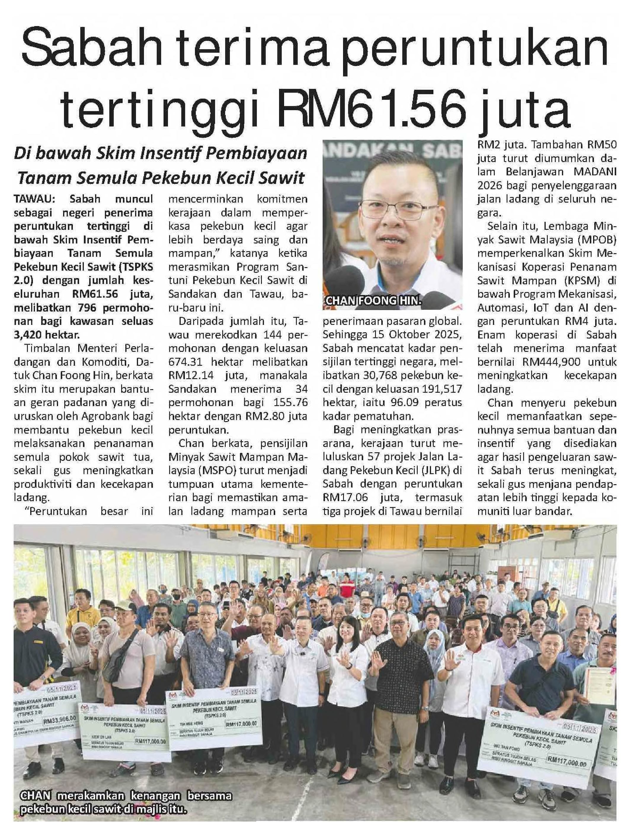 06/11/2025 www.utusanborneo.com.my Kerajaan salur RM12 juta bantu pekebun kecil sawit Tawau