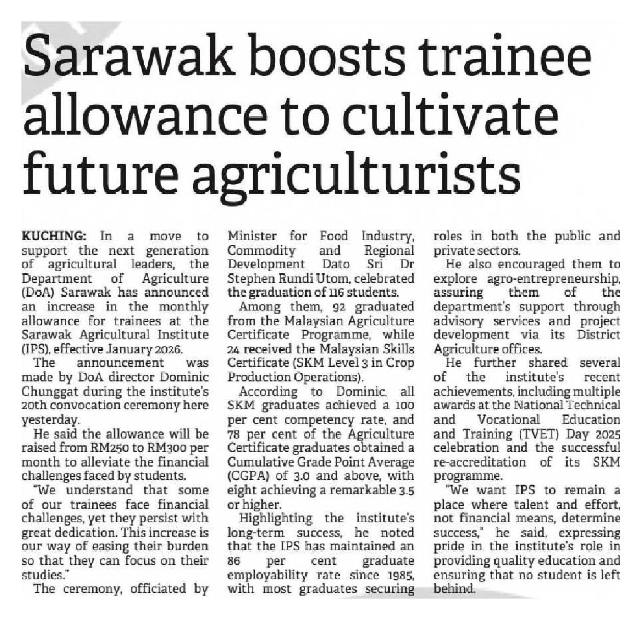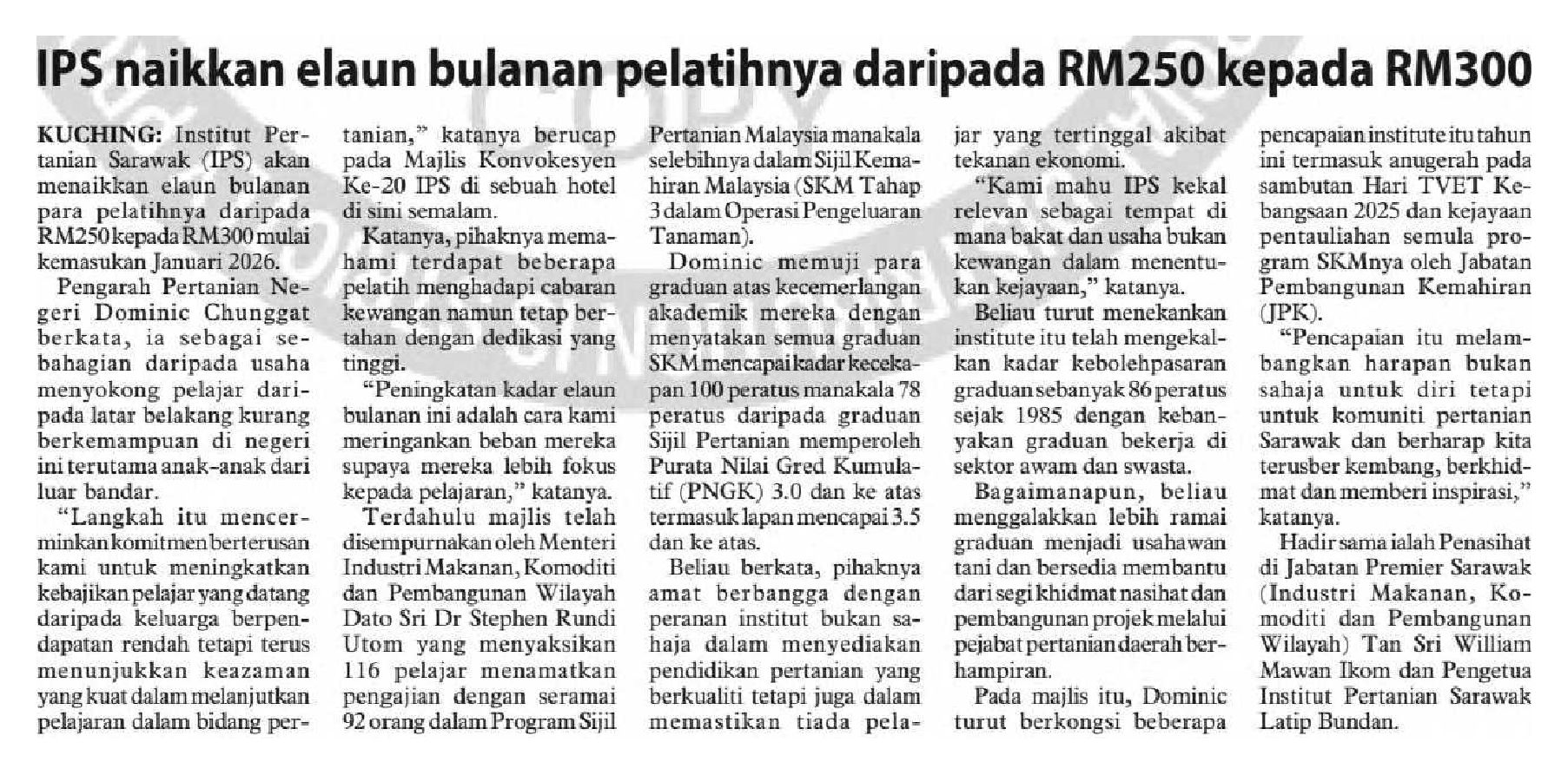 07/11/2025 Utusan Borneo Sarawak IPS naikkan elaun bulanan pelatihnya daripada RM250 kepada RM300
