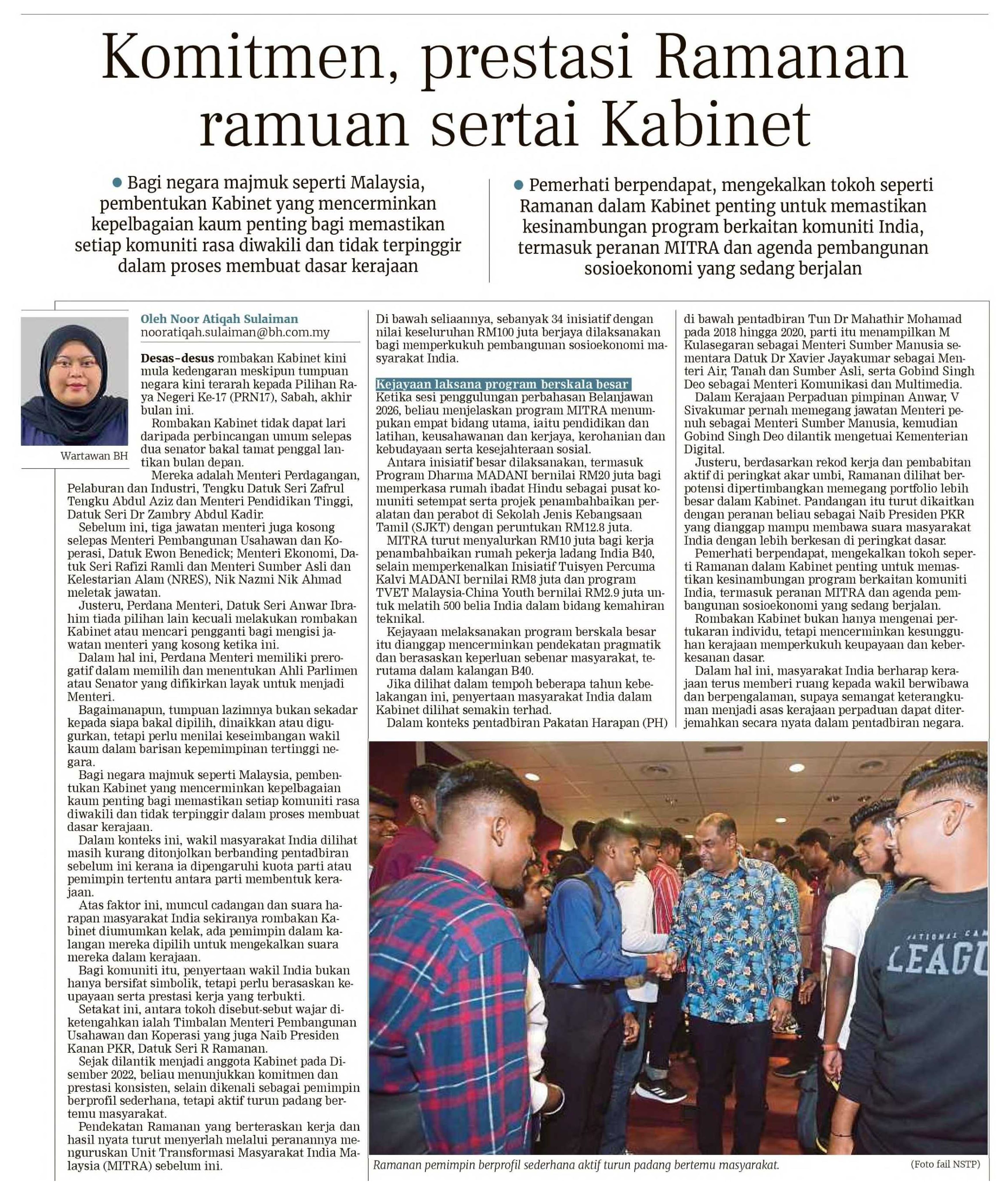 14/11/2025 Berita Harian Komitmen, prestasi Ramanan ramuan sertai Kabinet