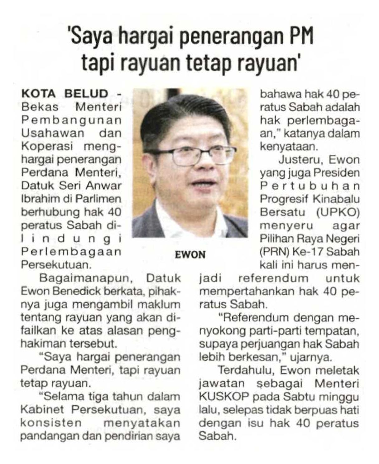 13/11/2025 Sinar Harian Online 40 peratus hasil Sabah: 'Saya hargai penerangan PM tapi rayuan tetap rayuan' - Ewon